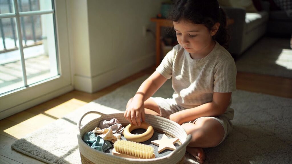 Koszyczek wyciszający, czyli sensoryczny koszyczek, to zbiór przedmiotów o różnych fakturach, dźwiękach i zapachach, które pomagają dziecku się uspokoić. Inspirowana postami, gdzie mamy dzielą się swoimi zestawami, stworzyłam swój. Uwierz mi, to nie są zwykłe zabawki, ale narzędzia do zabaw sensorycznych, które naprawdę regulują zmysły.
