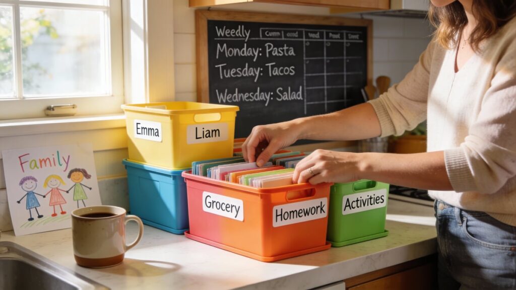 Porządek w domu przy dzieciach to też kuchnia bez paniki. Pamiętam, jak sama biegałam po sklepie codziennie, czując, że tracę czas i nerwy. Planuj posiłki na tydzień – nie szwendaj się po sklepach. Ja mam tabelę: poniedziałek – zupa, środa – makaron.