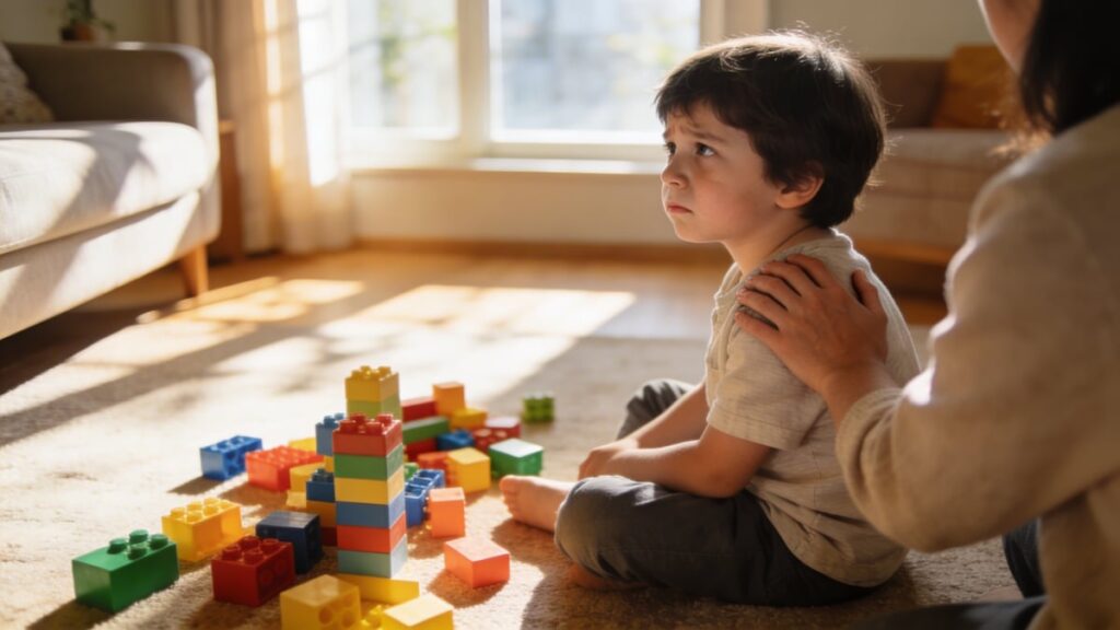 Tip: W takich chwilach kluczowe jest używanie mniejszej liczby słów. Zamiast długiego wywodu „Przestań natychmiast, bo…”, spróbuj powiedzieć po prostu: „Widzę, że jesteś zły. Przytulisz się?”. To buduje połączenie, zanim przejdziemy do jakiejkolwiek korekty. Działa cuda!